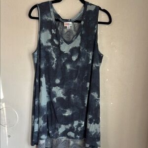 This LuLaRoe tank top features a sleeveless design with a scoop neckline, showcasing a beautiful blend of blue and gray in an abstract pattern. The lightweight fabric offers a relaxed fit, making it perfect for a casual, stylish look.