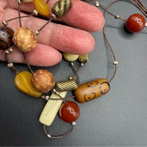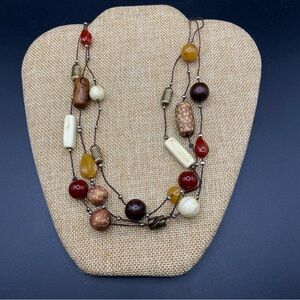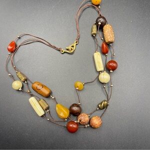 Triple Strand Bohemian Natural Style Bead Necklace. Measures approx 20” and has Goldtone hook clasp. Necklace is in good condition and appears only gently worn. Beads are acrylic and in beautiful condition. #25