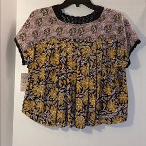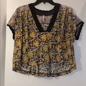 Free People women's size small. Channel your inner romantic for this Free People™ Leilani Tee. Boxy, cropped tee boasts charming florals at the front with a paisley-inspired pattern at the shoulders and yoke. Lace-trimmed collar and cuffs. V-neckline. Short sleeves. Straight hemline. 60% cotton, 40% polyester.