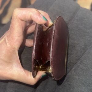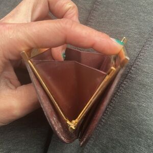 Elegant Cartier coin purse in burgundy leather with gold kiss lock clasp.