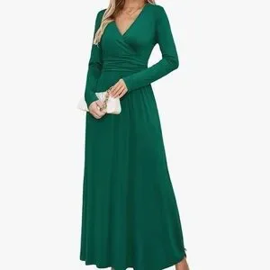 Turn heads in this elegant emerald green maxi dress from OUGES, perfect for weddings, maternity shoots, parties, or holiday gatherings. This long sleeve faux wrap dress in size Large features a flattering V-neckline, ruched waistband, and a softly draped silhouette that works beautifully across seasons.