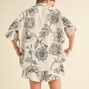 Be ready for the weekend in this oversized button down top and shorts set, featuring a playful floral print and convenient pockets. Made with linen for a comfortable and stylish fit.