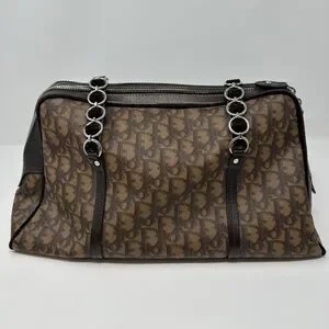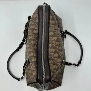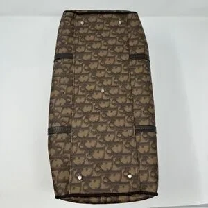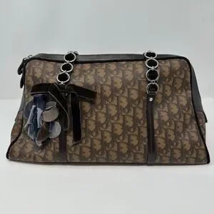 This authentic Dior bag is in excellent condition. It is the largest size of this model available. It has coated canvas Dior print with leather and velour trim. It is brown with a bow and beautiful flower appliqué. There are very fine marks along the leather by the top of the zipper line as seen in the photo.
