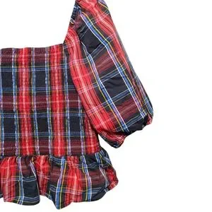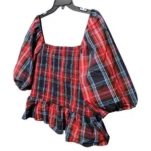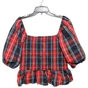 Draper James Red Plaid Smocked Peplum Poof Sleeve Top Womens Size Extra Large XL