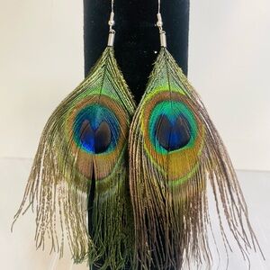 Lightweight Peacock feather earrings featuring vibrant green and blue hues. Perfect for adding a touch of nature-inspired beauty to any outfit.