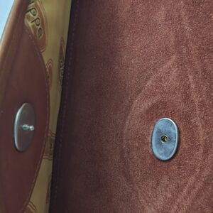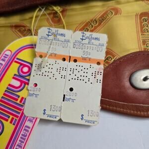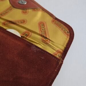 Vintage Phillippe genuine suede clutch purse with snap closure and gold logo lining. Rich chestnut brown with a contrasting leather detail on the flap. Deadstock with original Bylums tags attached—made in California and never used. A true 1970s American handbag brand moment with bold branding and buttery soft suede.
