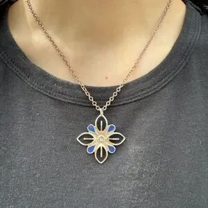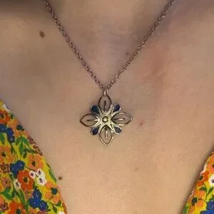 This exquisite necklace showcases a silver-toned pendant with a floral design, accented by a delicate blue hue. The pendant's three-dimensional quality adds depth and elegance, making it a versatile piece for any occasion. Paired with a simple silver chain, it offers a sophisticated yet casual look.
