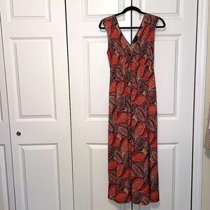 Tribal maxi dress with cinched waste line and cinched shoulder detail. V neck criss cross. Back is a v dip design. Beautiful color combination of browns, reds and orange. Excellent condition.