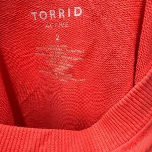 Keywords: Torrid Active, orange top, women's activewear, cross-back design, V-neck, long sleeve, breathable, soft, casual wear, fall fashion, machine washable, pre-owned, size 2X, comfortable, stylish.