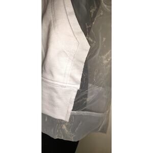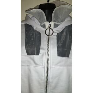 By Fashion Nova, this White Hoodie Jacket is mostly Sheer with white material in different places, including a tie in back but it is at the top of the back, very strange & eclectic. The solid material on this jacket is sewn with very RAW EDGES and there is a silver zipper that zips up the front. 2 pockets on front. The Tag says NEW MUSE HOODIE on it. A Boxy fit, very interesting. Will definitely make a statement in this!