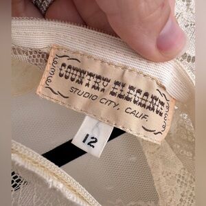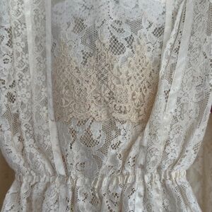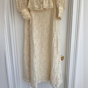 Features: prairie style dress with long bell / trailing sleeves, a high collar, and a floral lace skirt. Patches are varied with dotted swiss, eyelet lace, etc, and with lace accents throughout. Off-white / winter white / ivory Zip up back. Skirt is fully lined and a lace lined camisole for the blouse.
