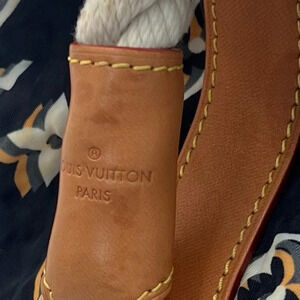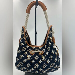 0234 - The Louis Vuitton Navy Blue Monogram Limited Edition Bulles MM Bag is a stylish hobo bag from the 2010 Cruise Collection designed by Marc Jacobs. Crafted from navy blue textured nylon, it features a distinctive white, grey, and beige monogram in a triple printed pattern. The bag is accented with caramel-colored leather, vachetta trim, and rope details, including a thick rope shoulder strap with a calfskin leather shoulder pad and a rope cinch cord. Additionally, it has a brass Louis Vuitton logo plate, giving it a luxurious finish. Its dimensions are approximately 18"W x 15"H x 7"D, making it spacious enough for daily use while maintaining a casual look suitable for both poolside and city settings.