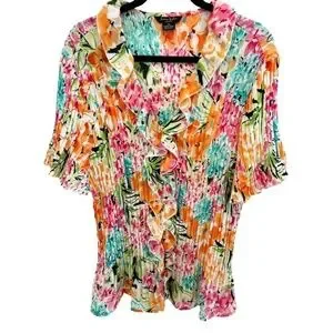 Sunny Taylor Plus Size Floral Pleated Short Sleeve Ruffle V-Neck Top Size 2X