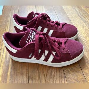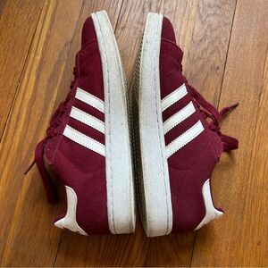 Stylish Adidas Campus sneakers in burgundy with white stripes. Perfect for casual wear.