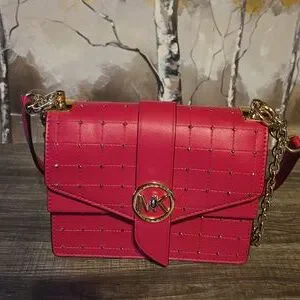 Micheal Kors Greenwich studded Handbag with pale gold tone hardware in good condition, crossbody 100% polyurethane, adjustable strap 12.5”-21.5”,lining 100% polyester, turn -lock fastening, 7.75”W x 5.75”H x 3.25” D.