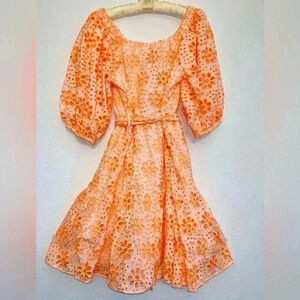 New with tags! Eyelet Fabric, Elbow Length Puff Sleeves with Elastic Stretch, Ruffle Hem, Sash, Square Neckline, Partially Lined, 100% Cotton, Embroidery: 100% Polyester, Lining: 100% Cotton.