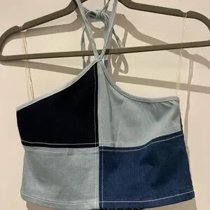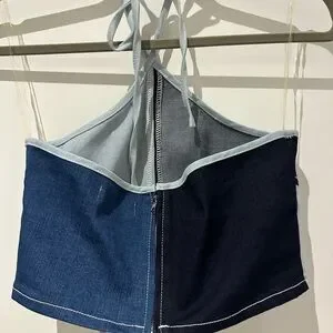colorblock halter top with shades of blue denim Ties at neck and has zipper with clasp