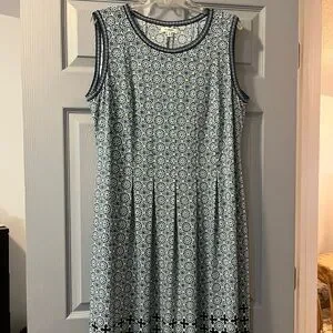 This sleeveless sundress by Max Studio features a scoop neck and a pleated midi skirt, perfect for casual or work settings. The dress showcases a sophisticated blend of blue and green, offering a versatile and stylish option for warm weather. Its lightweight fabric and elegant design make it a go-to choice for a polished yet relaxed look.