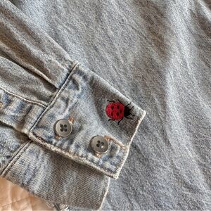 Stylish distressed denim shirt with colorful bug embroidery. Features a classic button-up design and frayed edges. So cool! Size Small - measurements in photos. I would love to find this in a medium or large if anyone is selling! Smoke free home.