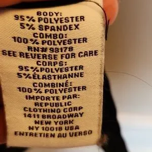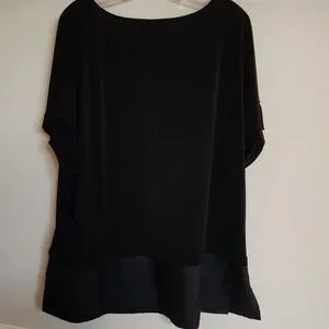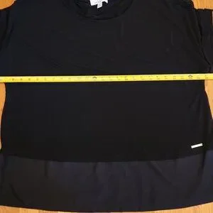 M Magaschoni Woman Short Sleeve 2 Fer Black Blouse in Polyester Spandex blend. Shorter style with sheer material at the bottom. Used condition.... see photos. Questions? Leave a comment below!