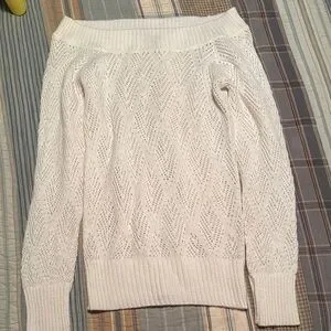 This off-the-shoulder sweater in a pristine white hue features a beautifully intricate cable knit design. Its soft and cozy texture makes it a perfect choice for chilly days, offering both style and warmth. Rue 21, M.