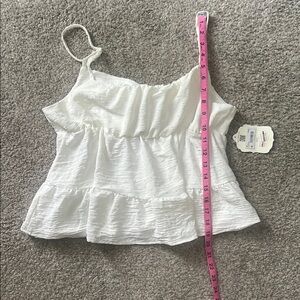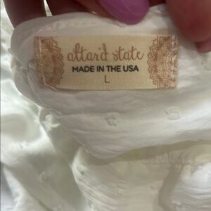 This elegant white camisole from Altar'd State features a charming smocked design with delicate ruffles and a tiered silhouette. Its sleeveless style and lightweight fabric make it ideal for warm weather. The top's feminine details add a touch of sophistication to any ensemble.