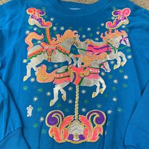 Vibrant blue sweatshirt featuring a colorful carousel horse design.