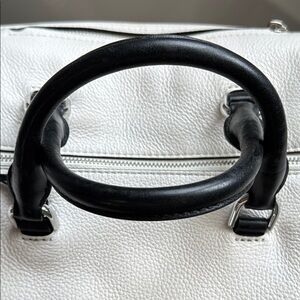 Pebbled white leather with black accents and silver tone branded hardware.