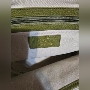 This rare, amazing green tote boasts a sleek design crafted from top grain leather. Its structured form makes it a versatile choice for everyday use, offering both style and functionality. The bag's clean lines and sophisticated color make it a timeless accessory for any wardrobe.