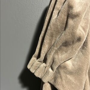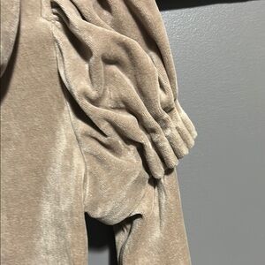 Stylish tan jacket with a hood and zip-up front. Features unique sleeve details.
