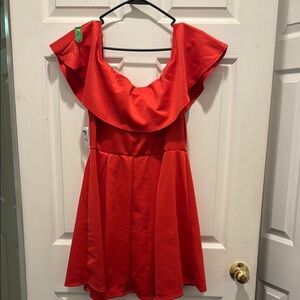This vibrant red mini dress by Charlotte Russe showcases a romantic off-the-shoulder neckline with flutter sleeves and a playful peplum hem. Ideal for a cocktail night out, its A-line silhouette and structured fabric offer a flattering and stylish fit.