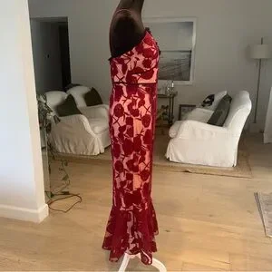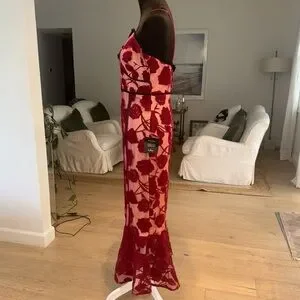 Lulus Alluring Dream Burgundy Floral Mesh Lace Trumpet Midi Dress Red - Size M