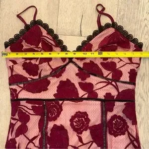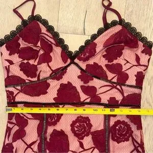 Lulus Exclusive! Even in the most crowded rooms, the Lulus Alluring Dream Burgundy Floral Mesh Lace Trumpet Midi Dress will have you captivating everyone! An elegant combination of sheer mesh, lace-like burgundy embroidery, and beige stretch-knit lining shapes a stunning darted bodice and V-neckline (with contrasting black scalloped lace trim) supported by adjustable spaghetti straps. A set-in waist, with pierced ladder crochet cutouts, continues to a figure-flaunting midi skirt that ends with a trumpet hem. Hidden back zipper/clasp.