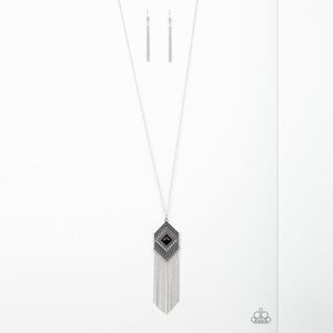 A square black bead is pressed into the center of a silver geometric pendant radiating with studded detail. A shimmery silver fringe swings from the bottom of the tribal inspired frame for a wanderlust finish. Features an adjustable clasp closure.