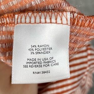 Description- reddish/orange and white stripes. Flared bottom. Has front and back cut outs.