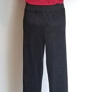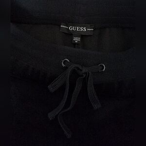 A drawstring pant from Guess that features an easy laid back pull on finish enhanced with eye catching detail, a dazzling logo charm at the front and soft lush material for a modern chic look. Size M. Color Black. "G" Charm on left front hip. Approx 1.75" wide elasticized waistband with drawstring. Cotton/Poly. Relaxed straight fit. Approx 33" Inseam. 10.25" front rise. Machine washable. New with tags.
