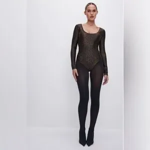 This stunning bodysuit from Good American features a sleek black base adorned with a shimmering gold pattern, creating a luxurious and eye-catching look. The long sleeves and fitted design ensure a flattering silhouette, while the backless style adds a daring touch. Perfect for making a statement at any event.