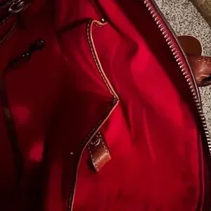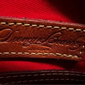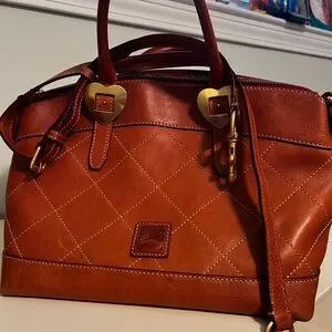 Elegant brown leather handbag with heart-shaped accents. Perfect for any occasion.