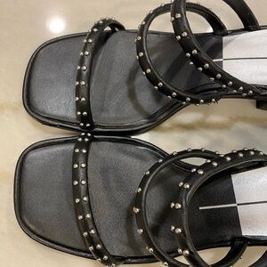 Dolce Vita Rye Studded Sandals in size 8.5. Black vegan faux leather with silver studs. Approx 2 inch heel. Only flaw is a small cut on edge of upper right sandal that was present when purchased. No other flaws. Only worn once, overall great condition with hardly any wear on soles.
