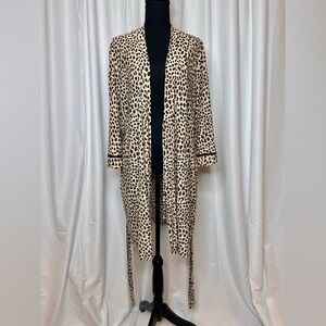 Vintage 2000s Leopard Kimono robe, soft polyester. Has a sewn in tie attached. Pit to pit 20” length 40” sleeves 18” with a beautiful black satin trim.