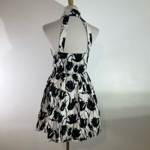 This stunning sleeveless mini dress from Anthropologie features a bold black and white floral pattern, perfect for a cocktail night out. The halter neckline and fit-and-flare silhouette create a flattering and feminine look, while the structured fabric ensures the dress maintains its elegant shape.