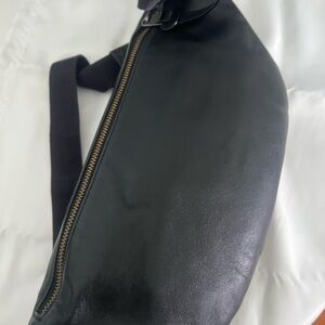 Stylish Coach belt bag in brown and black. Features signature pattern and adjustable strap.