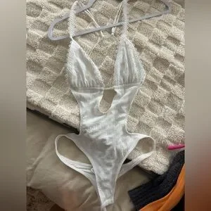 Elegant white lace bodysuit with delicate trim. Perfect for layering or as a statement piece.