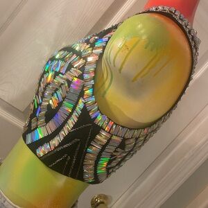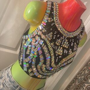 This Bebe crop top is a stunning sleeveless piece, featuring a black base with intricate sequin embellishments. The top showcases a bold geometric pattern, highlighted by a beaded neckline that adds a touch of elegance. Its vibrant design makes it a perfect statement piece for any occasion.