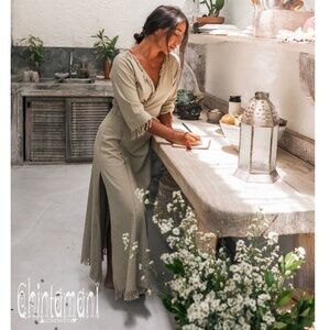 Boho Maxi Wrap Dress by Chintamani Alchemistry made of 100% raw cotton with 3\4 length sleeves, handmade fringe and side slits. Wrap around simple and classy design creates comfortable fit and complements tall and lean figure. Calm, genuine colors of this bohemian dress together with raw fabric structure are a perfect ensemble for nature meditation moments. Extremely comfortable handmade item created with attention to detail. Can be also worn as a cardigan.