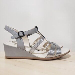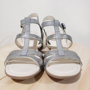 Ecco Silver Sandals Size 9 Wedge Heel Slingback Strappy Comfort Coastal Casual