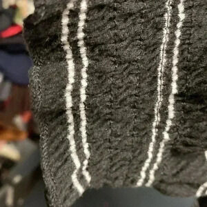 Comfortably soft Polyester rayon spandex pull over top. Black & cream with elastic in sleeve cuffs with bit if a ruffle hem. Approximate Measurements Laying flat: pit to pit 25” - shoulder to hem 27” - sleeves short with wide elastic. Preowned good used condition please check all pictures.