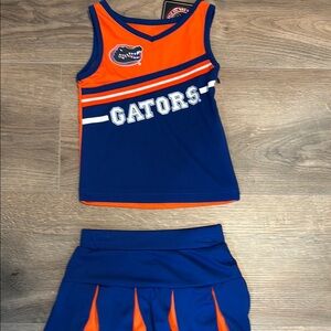 Vibrant orange and blue cheer outfit with Gators logo. Perfect for fans. Size 2T. Side zip on the top pictured. Two piece set.