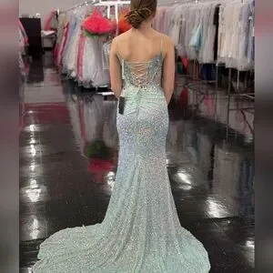 Multi-colored sequins make this long sequin prom dress G1655 an eye-catcher for your big night. With sequin patterns from the v-neckline to the hem, this long sequin formal dress is sure to shine at prom, galas, and other black-tie events. In misses and some plus sizes, this long sequin evening gown has a sheer corset that wraps around to the lace-up open back, while the hip-skimming long mermaid skirt opens in a side slit for a flirty look. A small train completes the look of this long sequin prom dress that is ready to make your entrance one the crowd will not forget. Worn once for prom.