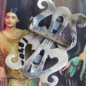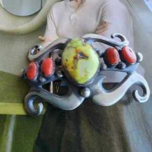 Stylish silver belt buckle with red and green stones. Perfect for adding a unique touch to any outfit.
